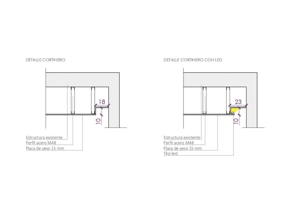 Cuando estamos empleando el pladur, un elemento de acabado es el hueco para esconder las barras de las cortinas, que puede ser simple o con la inserción de una tira de LED. El grosor del hueco que debe dejarse varía en función del modelo de cortina que se vaya a insertar, ya sea enrollable (15 cm) con uno o varios rieles (hasta 25/30 cm), por lo que cuando se está realizando la estructura para el yeso laminado en la obra ya debe quedar claro qué tipo de cortina se va a insertar.