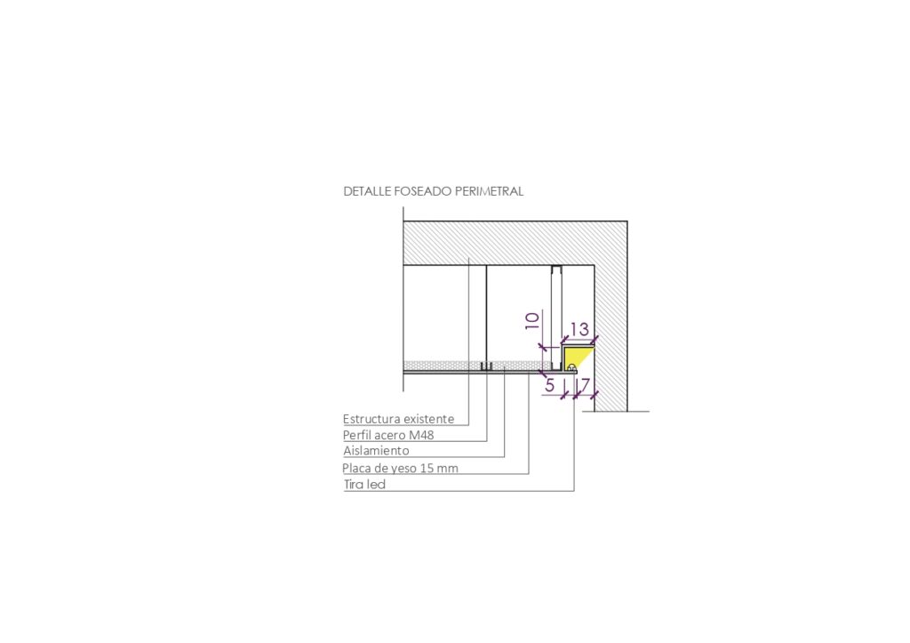 Para realizar este tipo de foseado, el falso techo debe rebajarse al menos 10 cm y el espacio vacío para el paso de la luz debe ser de 7/8 cm, espacio mínimo para permitir el mantenimiento de la tira LED, que debe aumentarse al menos un cm si se realiza en una pared con revestimiento vertical como la de un cuarto de baño o una boiserie.